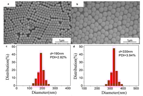 The size and distribution of the synthesized PS colloids visualized by SEM are shown in Figure 2. We can see that the two PS colloids with diameters of 190 nm and 330 nm are almost monodisperse with PDI less than 4%.