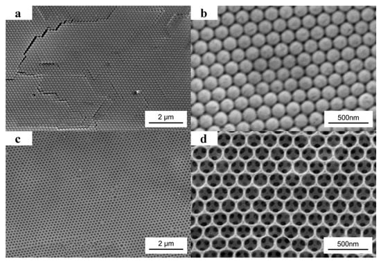 SEM images of the 190 nm PS colloidal crystal template are shown in Figure 3a,b. Figure 3b is a higher magnification image of Figure 3a. From the planar image, we can see that the monodisperse PS colloids adopt a hexagonal array in the crystal, which is the (111) plane of the fcc packing. As shown in Figure 3c,d, after filled the template with PEG prepolymer, UV exposure without photomask, and removed the PS colloids by THF, the order porous PEG hydrogel inverse opal was obtained. Figure 3d is a higher magnification image of Figure 3c. From Figure 3d, a triangular pattern below every hole can be visualized. It is because that along the (111) normal direction, each hole is just located above three holes of the subjacent layer. From Figure 3a,c, few defects can be visualized, which indicates the double-substrate vertical deposition method based on capillary force is very successful in making the highly ordered structures.