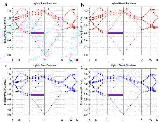 The band structures of colloidal crystals and inverse opals were simulated by commercial program (Band SOLVE, Rsoft design group, Tucson, AZ, USA). In the simulation, seven layers fcc structure was calculated, calculation steps were 16 and incidence angle was 0°, the refractive index of PS and PEG were 1.59 and 1.47, respectively. Figure 5a,b show the band structures of the PS colloidal crystals. The purple regions show the partial band gaps of fcc structure at Γ-L direction. The electromagnetic waves of the corresponding bang gap wavelength in these regions are prohibited from being propagated in the crystals along the 111 directions, which presented as reflected light. The reduced frequency (ω) of the partial band gaps ranges from 0.59 to 0.63. The bang gap wavelength λ = α/ω, where α is the periodic constant of crystal. For the fcc structure crystal, the relationship between α and microsphere diameter D is α = 1.414 D. As can be seen from Figure 5a,b, the reduced frequency (ω) of the band gap of PS colloidal crystals was 0.59 to 0.63. Accordingly, the band gaps of the colloidal crystals formed by 190 nm and 330 nm PS microspheres with fcc structures range from 426 to 455 nm and 741 to 791 nm, respectively. Figure 5c,d show the band structures of the inverse opals. The reduced frequency of the partial band gaps ranges from 0.75 to 0.81. Accordingly, the band gaps of the PEG inverse opals formed from 190 to 330 nm PS opals with fcc structures range from 332 to 358 nm and 576 to 622 nm, respectively. Since the location of the reflection peak of each sample in Figure 4 exactly matches the band gap range calculated in Figure 5, the simulated band structures of colloidal crystals and inverse opals shown in Figure 5. Agree well with the experimental results shown in Figure 4.
