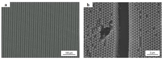 SEM images of 330 nm PEG hydrogel inverse opal micropatterns with 2 μm wide anti-swell-broken grooves: (a) low-magnification image; (b) high-magnification image.