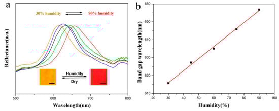 As shown in Figure 8, when the relative humidity increases from 30% to 90%, the structural color of the 330 nm PEG hydrogel inverse opal micropatterns change from orange to red, and red shift of the band gaps can be seen obviously in the whole process. The band gap wavelength increases linearly with the increase of humidity. According to Equation (1), the wavelength of the band gap is related to the diameter D of the reflector. For PEG hydrogel inverse opal micropatterns after removing the template, when the humidity increases, the PEG will swell in a certain degree, leading to the increase of D. As a result, the band gaps are red shifted. Additionally, the color variation is reversible due to the absorption and desorption of moisture in the ordered porous hydrogel structures under the humidifying and drying conditions. Compared with the traditional electrical humidity sensors, the PEG hydrogel detector is not only economic, but also a reversible naked-eye sensor.