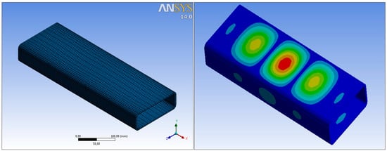 The Ansys Shell 181 element type was used (Figure 1). This is a typical four-noded quadratic shell element for non-linear problems. This type of element has been found as a suitable element for the simulation of members, connections, and structures made with structural hollow sections. Many examples can be found in previous works [12,13,14].
