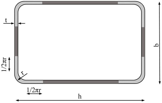 The AISI specification for the material properties of cold formed sections [18], widely proposed by many authors, like Ghersi et al. [19], presents a different equation that is essentially the same proposed by Abdel-Rahman et al. [20]. According to the arguments presented for model 2, the base material properties have been substituted by the material properties of the faces (fyf, fuf) in this formulation. The corner zone was considered as the rounded part plus two flat bands 1/2πr wide (see Figure 2). The yield limit in those corner areas can be calculated as shown in Equation (3):