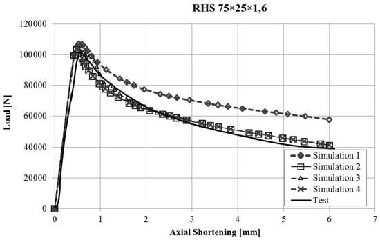 The force-displacement curves obtained with the finite element model of the stub-column tests were compared with the experimental results. Reasonably good agreement was obtained for all the tests, and in some cases, the results were very good, taking into account the inherent uncertainties that arise in this kind of simulations (geometrical imperfections, thickness changes, residual stresses, etc.). Since it would not be operative to present the curves for all the studied cases in this article, Figure 3, Figure 4, Figure 5 and Figure 6 present the force displacement curves of four stub-column cases (S02, S07, S10, S13) showing some representative shapes. The corresponding results of the four FE simulations with the different material models are drawn in the same graph in order to assess them.