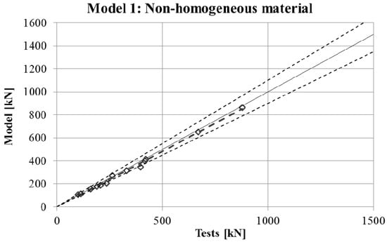 The maximum force in the force-displacement curve gives the strength of the stub-column. The values of strength obtained in experimental tests are compared in Figure 7, Figure 8, Figure 9 and Figure 10 for the four FE simulations with different material models. A simple linear regression was plotted for each set of comparison points in order to visually evaluate the difference between the grey line that represents a perfect match and the set of results. Additionally, two dotted lines represent a separation of 10% from the ideal result.