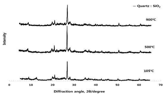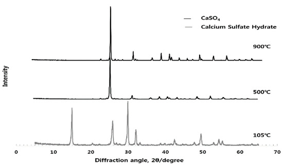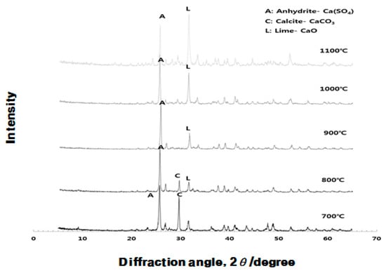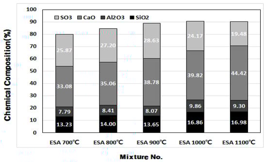 Figure 11 shows that as the crystal structure changes as a function of the burning temperature of ESA, the peak is generally higher for the anhydrous gypsum and it turns into the peak of CaCO3 at 700–800 °C and then into the peak of CaO at 900 °C or higher. ESA-mixed OGE shows the best compressive strength at 800 °C in terms of the burning temperature. In this region, XRDs of anhydrous gypsum, CaCO3, co-exist.