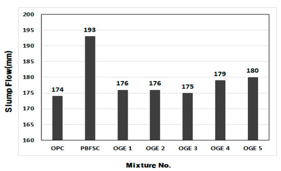 Figure 5 displays the measured values of the mortar flow at different burning temperatures of ESA. The value of flow for 100% OPC mortar was 174 mm, the lowest among all the experiment factors. The one with the largest flow was PBFSC, which showed a value more than 11% higher than the flow of 100% OPC. The flow of ESA-mixed OGE factors was 0.5–1.0% larger than the flow of OPC, which is almost the same as the flow with OPC. Further study on the constructability of concrete in its fresh state, including time-lapsed changes in the value of flow, will have to be conducted in the future.