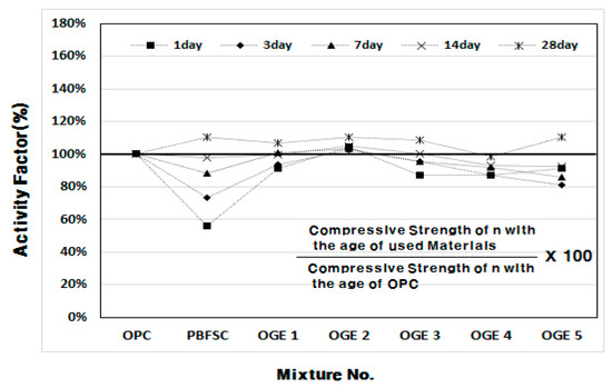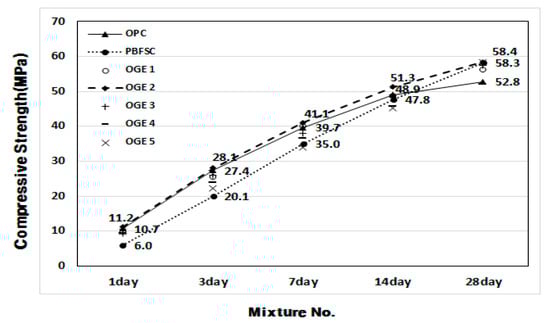 Figure 6 and Figure 7 show the plots of the compressive strength development of OGE mortar at different ESA burning temperatures. The three compressive strengths for each age are shown as average values. When the compressive strength is measured, the activity factor of PBFSC is 56.1–73.4% of the factor for 100% OPC from the first to third day of early aging. Such low early-strength poses a serious problem in the construction industry because it restricts the shortening of the construction period. For OGE with the ESA, a higher burning temperature did not result in a higher compressive strength, but caused a strength decrease. However, OGE 2 that employed OGE at 800 °C, burns at a low temperature and shows an activity factor of 102.6–104.7% that fulfills the criteria for strength during the early aging stage (on the first and third day of aging). Interestingly, the compressive strength at a long-term age on the 28th day is also satisfactory. Therefore, the use of OGE at 800 °C is thought to not only activate the reaction of GBFS earlier, but also affect the compressive strength during long-term aging. Such a result also indicates that burning at a low temperature reduces the requirement of energy use.