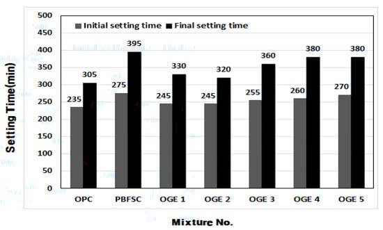 Figure 8 shows the setting time of OGE cement paste at different ESA burning temperatures. The time of initial setting and final setting was the earliest for 100% OPC, respectively. The initial and final settings of PBFSC were 40 and 90 min later than those of 100% OPC. These settings indicate that the reaction of cement is substantially decelerated, resulting in a delay in the setting time. The speed of the reaction of OGE is slowed following an increase in the ESA burning temperature. For OGE2 which showed a satisfactory compressive strength, the same cement reaction was observed. The Initial setting time was 245 min and the Final setting time was 320 min.
