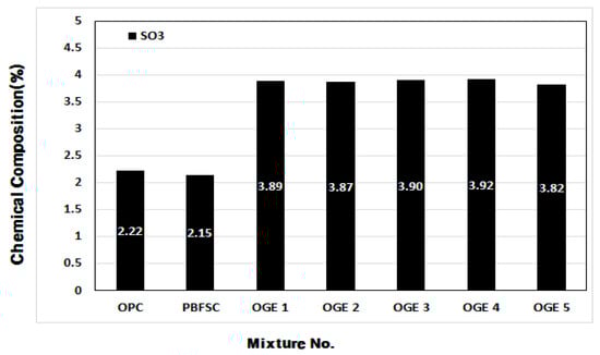 Among the major chemical components of ESA, the SO3 content decreases, while the CaO and SiO2 content increases as the burning temperature increases. Such changes are thought to be attributed to the change in the chemical composition following the decarboxylation of LP and combustion of CO2. In comparison with OPC, the SO3 content in PBFSC is higher by approximately 2%. The SO3 content in OGE with ESA burnt at different temperatures is also greater by approximately 2% when compared to PBFSC.