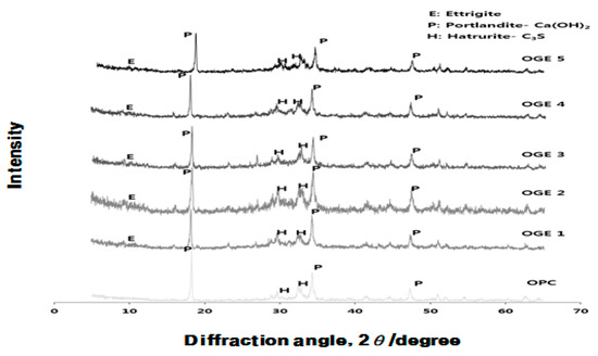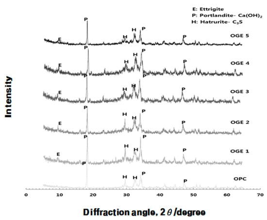 - In the XRD and XRF analysis, an increase in the early compressive strength development of OGE was caused by the continuous generation of Ca(OH)2 from the pH of the strongly alkaline ESA. In addition, the early strength development was also attributable to the generation and filling effect of C-S-H and Ettringite from the supply of SO3.