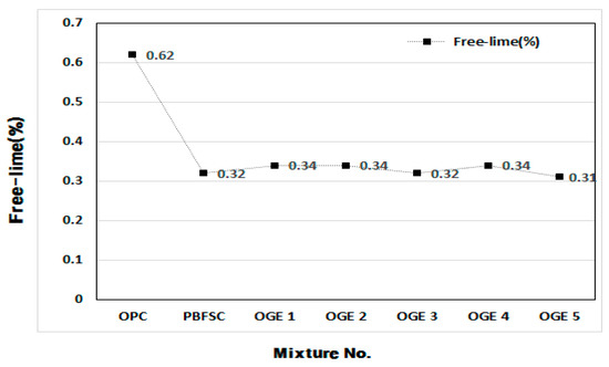 A test (free-lime) on the stability of OGE at different burning temperatures of ESA was conducted. It was based on the formula below, by using the Ethylene Glycol method. As displayed in Table 8 and Figure 14, the expandability of OGE and size of the degree of cracks compared with those of OPC. The largest amount of free-lime existed in OPC and the amount was 50 to 54.8% in ESA-mixed OGE, in comparison with OPC. Such a result indicates that OGE is stable for expandability and cracks are caused by free-lime. Generally, the content of free-lime in OGE is similar for different burning temperatures of ESA.