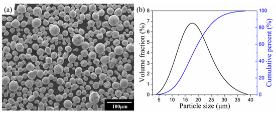 (a) Morphology of 316L powder; (b) particle size distribution of 316L powder.