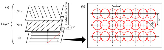 (a) Scanning strategy; (b) spot-to-spot fabrication process, where “s” is point distance, “h” is hatch space, and “Φ” is laser beam spot size.