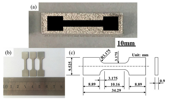 All of the samples were sectioned by wire cutting equipment (Cmne, Beijing, China), and then ground and polished following standard metallographic procedures. Metallographic specimens were prepared by standard polishing equipment, which were etched by a solution of 4 mL HF, 4 mL HNO3, and 92 mL C2H5OH. The sample cross section microstructures were observed by using SEM and OM. The sample relative densities were determined by the cross-section method, which is based on the analyzing optical micrographs and Image J software. The sample cross section porosity was measured twice in different location. The sample relative density can be calculated by the percentage of porosity area in the block cross section area. Also, when the two data is averaged, the sample relative density can be obtained. Figure 3a through Figure 3c provides the characteristics of the tensile specimen that is about the specimen of the macrograph, shape, and geometrical size. Also, the tensile specimens were evaluated using Instron 5966 (Instron, Boston, MA, USA) at room temperature. At a displacement rate of 0.01 mm/s, a dynamic strain gauge extensometer was applied to record the data.