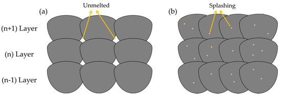 Schematic of selective laser melting (SLM) with (a) un-melted defects; (b) splashings phenomenon.