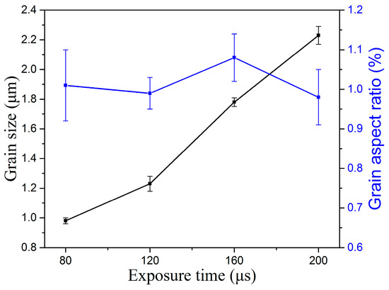 During the SLM fabrication process, the microstructure is the main influence on exposure time, and can be a function of exposure time. The different exposure times result in the different microstructure. The cross section of the microstructure was observed when selecting the exposure times of 80, 120, 160, and 200 μs. The microstructures of different exposure times can be depicted as in Figure 10, and the graphical representation of these microstructure characteristics of the grain size and grain aspect ratio is shown in Figure 11. As the exposure times increase, the grain size grows slowly from 0.98 μm to 2.23 μm, and the grain size is very fine. Due to the spot-to-spot fabrication with a high degree supercooling of each molten pool, the microstructure is indicated by a mostly equiaxed crystal and a small amount of columnar crystal. Figure 11 also reflects the grain aspect ratio at the different exposure time; the grain aspect ratio indicates the difference in grain size along the horizontal and vertical directions. At exposure times from 80 μs to 200 μs, the grain aspect ratio is close to 1 and is indicated that the grain process isotropic mechanical properties in horizontal and vertical directions [42].