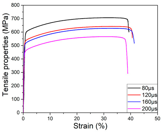 Tensile properties of samples with different exposure times of 80 μs, 120 μs, 160 μs, and 200 μs.