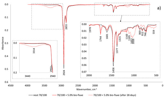 FTIR spectra of neat bitumen and fluxed bitumen by rapeseed oil methyl ester: (a) 70/100 bitumen; and (b) 35/50 bitumen.