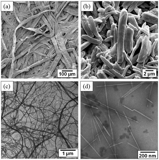 SEM images of different cellulose particle types: (a) wood fiber; (b) MCC; (c) microfibrillated cellulose; and (d) tunicate cellulose nanocrystals (adopted from [1]).
