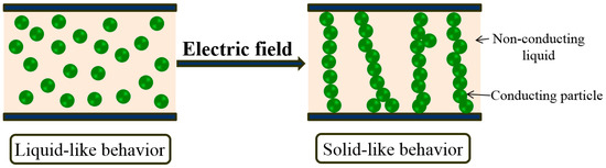 ER fluids are one of the most interesting smart materials. They are suspension systems of dielectric/semi-conducting particles dispersed in nonpolar liquids, which construct fibrillated particle structures under applied external electric fields due to the difference in dielectric constant between the particles and the insulating oil [47], as shown in Figure 5. In contrast, ER gels and ER elastomers have either an elastomer or gel suspension medium, respectively [48]. Among the various polarization mechanisms, interfacial polarization is known to be closely related to ER phenomena [49,50]. The reversible phase transition from liquid-like to solid-like provides control of a variety of viscoelastic characteristics such as yield stress, shear viscosity, and dynamic modulus by using applied electric fields [51,52]. Because of this, ER fluids have drawn great attention as smart functional materials [53]. Most ER fluids show Newtonian-like liquid behavior, with a slope of 1.0 when shear stress is plotted against shear rate in log-log graph. However, an applied electric field induces the transition of the liquid-like state into a solid-like state through the formation of a column like structure along the electric field direction. The competition between the hydrodynamic breakdown under an applied shear during rheological measurement and the attractive force under an applied electrical field is responsible for many interesting rheological characteristics of the ER fluids. Because of this, the rheological behaviors of ER fluids have been described using various rheological equations of state, including the Herschel–Bulkley fluid model, Bingham fluid model, [54], Seo–Seo model [55], and Cho–Choi–Jhon model for flow curve analysis [56].
