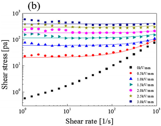 Flow curves of the stress of the phosphate MCC ER fluid under different electric field strengths: (a) fitted by the Cho–Cho–Jhon (CCJ) model; and (b) fitted by the Bingham fluid model [70].