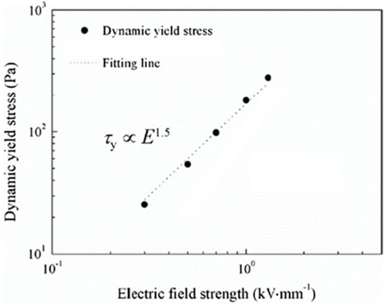 To intensively study the ER properties of the MCC based ER fluid, the data in Figure 6a were re-plotted. The double logarithmic coordinates of dynamic yield stress () versus electric field (E) are indicated in Figure 8, and the dotted line is a fitting line, in which the values of the MCC ER suspension and E were related by the formula of . Here, the exponent is 1.5, in accordance with the conduction model [113,114,115].