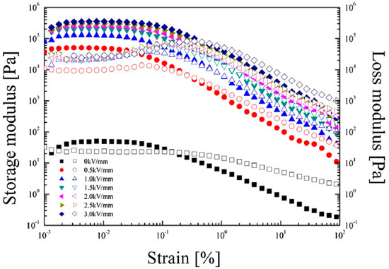 Storage modulus (filled symbols) vs. strain and loss modulus (open symbols) vs. strain for the phosphate MCC ER fluid under a series of external electric field strengths (reprinted from [70]).