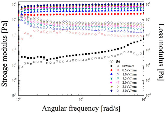 Storage modulus (filled symbols) vs. angular frequency and loss modulus (open symbols) vs. angular frequency for the phosphate MCC ER fluid under a series of external electric field strengths (reprinted from [70]).
