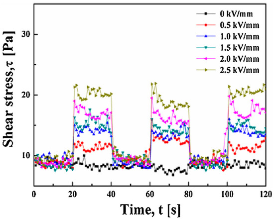 Figure 11 displays the steadiness and sensitivity of the CC material based ER fluid at a set shear rate of 1/s and a square-wave pulsed voltage signal of 20 s. During each cycle, the electric field was turned on and maintained at a constant voltage for 20 s, then switched off for 20 s. Data were plotted every 0.1 s. When the electric field was applied, the shear stress increased to a higher value, which remained relatively stable until the electric field was turned off. In addition, the shear stress jumped to the higher value over 0.1 s, since the off–on (or on–off) borders contained few points. Namely, the CC particles needed little time to form and strengthen the chain-like structures under an applied electric field. At the off–on (or on–off) borders, the first datum usually remained unchanged from the previous value, indicating that the response time ranged 0.1–0.2 s [116]. In addition, the shear stress increased with the increased voltage when the field was switched on.