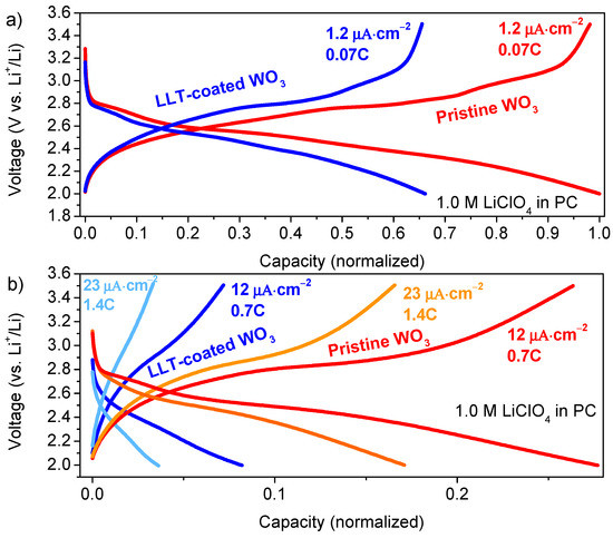 - Li, W.; Sasaki, A.; Oozu, H.; Aoki, K.; Kakushima, K.; Kataoka, Y.; Nishiyama, A.; Sugii, N.; Wakabayashi, H.; Tsutsui, K.; et al. Improvement of Charge/discharge Performance for Lithium Ion Batteries with Tungsten Trioxide Electrodes. Microelectron. Reliab. 2015, 55, 402–406. [Google Scholar] [CrossRef]
