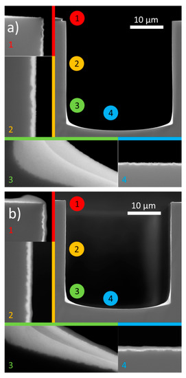 - Thermophoretic forces, i.e., the repelling force caused by a huge pressure gradient near to the hot surface [58], are larger in the case of small trenches. Carrier gas diffusion into a small trench is more difficult than in to a broad trench, leading to an increased thermophoretic force for smaller trench. Therefore, layer deposition into deeper parts of the trenches is becoming more difficult.