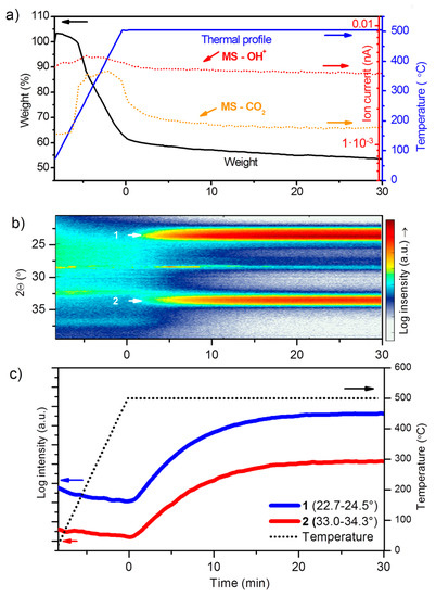- Truijen, I.; Hardy, A.; Van Bael, M.K.; Van den Rul, H.; Mullens, J. Study of the Decomposition of Aqueous Citratoperoxo-Ti(IV)-Gel Precursors for Titania by Means of TGA-MS and FTIR. Thermochim. Acta 2007, 456, 38–47. [Google Scholar] [CrossRef]