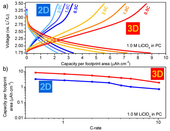 - The current collector may remain an issue; upon cycling, the voltage drop at the start of the measurement is significantly larger for the 3D samples than for the 2D samples (Figure 8a). This illustrates that higher resistance is presence in these 3D samples, which is primarily attributed to the partial oxidation of the TiN current collector (20 nm). As the TiN current collector is much thicker for the 2D samples (80 nm), and the applied currents are much lower, this leads to lower IR-drop for planar films, compared to the 3D counterparts.