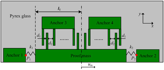Half of the sensitive component is selected to derive the analytical expressions of performance, zero offset and sensitivity of the micro-accelerometer. The folded beams anchored to separated sides are represented by two springs with different stiffness constants, k1 and k2, due to fabrication errors [21] (Figure 2). The output of the accelerometer, according to Equation (1), is directly proportional to the differential capacitance, which is dependent on the relative position between the fixed fingers and movable fingers. Therefore, the positions of finger anchors (3, 4) and the proof mass determine the performance parameters of the micro-accelerometer, and are influenced by the stress state of the whole structure. Ideally, the free state of packaged accelerometers should show no internal stress, but the packaging process with a fluctuating temperature leads to thermal stress in the chip due to different thermo–mechanical properties of the structural materials. Thus, the zero offset or bias of the micro-accelerometer can be expressed as [22]: