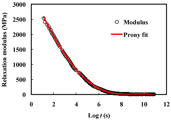 For this study, the master curve needs to be transformed into Prony series for modeling and experiments (Figure 5). The coefficients of Equation (6) with nine Prony pairs are listed in Table 2, where E0 is the instantaneous modulus when time is zero.