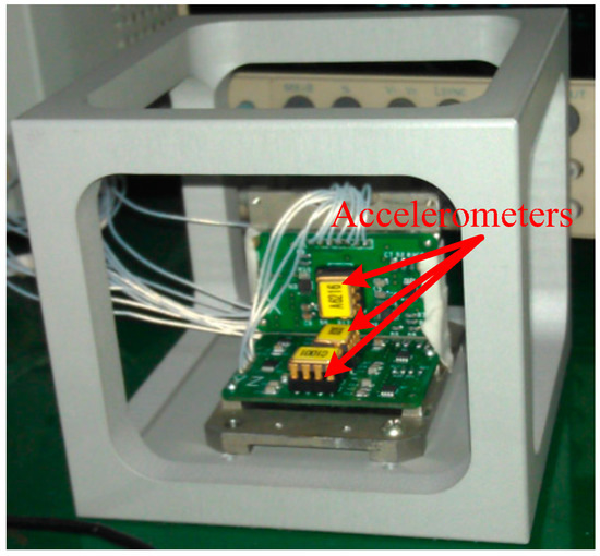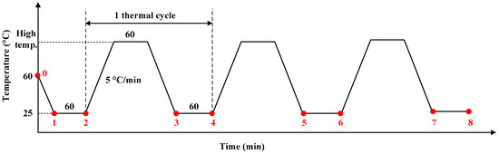 The simulation introduced the Prony series modulus into the whole finite element model (FEM) in ABAQUS software to acquire the output of the micro-accelerometers over time and temperature. The thermal experiment was carried out in an incubator with an accurate temperature controller. Each thermal test involved three micro-accelerometers mounted at a cube fixture (Figure 6). The full loading history used in both simulation and experiment is shown in Figure 7. The red-marked points represent the starting or ending points of a loading step. The analysis started at the curing temperature (60 °C, 0) at which the internal stress of the structure is zero. Then, the model was cooled to room temperature (25 °C, 1) with a rate of −5 °C/min and kept at that temperature for 60 min (2), and then the temperature was raised to a higher temperature with 60 min holding, followed by a temperature decrease to room temperature (3) with the same change rate and holding (4). The high temperature points were 50, 75 and 125 °C for the three groups of tests, respectively. The accelerometers in each group were subjected to three high–low temperature steps. The devices kept at room temperature after curing and cooling were also simulated and tested.