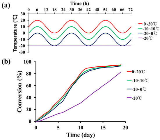 STP and DD were mixed at a mass ratio of 10:1, and the mixture was poured in molds that were 25 mm in diameter and 1 mm in height. The mixture was allowed to react for 19 days at −20 °C (constant temperature), −20–0 °C (cycle), −10–10 °C (cycle), and 0–20 °C (cycle) (Figure 2a). Samples were taken periodically and analyzed by FT-IR spectroscopy. The mass ratio of 10:1 was selected because viscoelastic products were obtained from STP and DD mixtures with a mass ratio range of 8:1–12:1 in preliminary experiments. The degree of conversion of silanol groups of STP was analyzed by an IR band-ratio method. The absorbance of the O-H stretch band at 3330 cm−1 was divided by that of a reference C-H stretch band at 2960 cm−1 (Figure S1). The degree of conversion was calculated using the following equation,