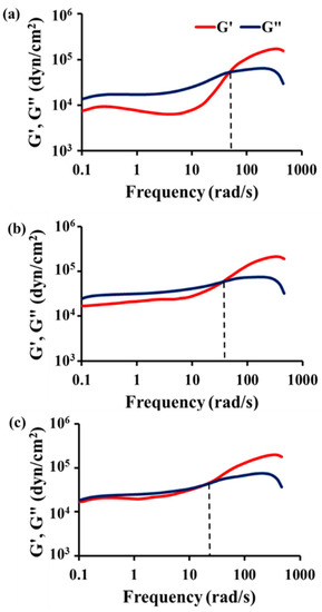 Storage modulus (G’) and loss modulus (G”) of the reaction product measured at (a) 30 °C; (b) 5 °C; and (c) −20 °C. The reaction product was obtained by the reaction of the STP/DD 10:1 (by mass) mixture at −20 °C for 19 days.
