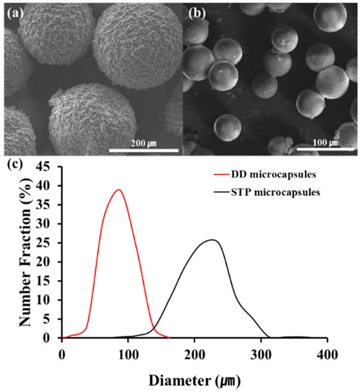 STP and DD were microencapsulated using urea-formaldehyde polymer and polyurethane as shell materials, respectively. The STP-loaded microcapsules were obtained by in situ polymerization, and the DD-loaded microcapsules were formed by interfacial polymerization. The size and the shape of the microcapsules were observed by scanning electron microscopy (SEM) (Figure 4a,b). Spherical microcapsules were formed at an agitation rate of 1000 rpm. The size distribution of the microcapsules was investigated by optical microscopy (Figure 4c). The average diameters of STP- and DD-loaded microcapsules were 240 and 90 μm, respectively.