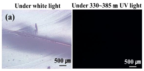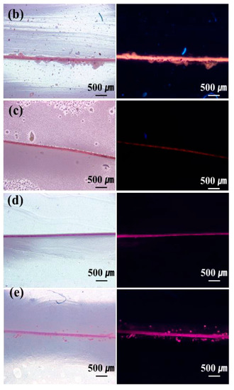 The low-temperature release of STP and DD in the self-healing coatings was studied. A fluorescent fluid was mixed with STP or DD to visualize the release of the core materials from broken microcapsules. For comparison, microcapsules containing a mixture of n-hexadecane and the fluorescent fluid were prepared and embedded in the enamel paint. After storing and scratching the self-healing coatings and comparison coatings at −20 °C, they were observed by optical microscopy under white light or 330–385-nm UV light at room temperature or lower. Optical microscopy showed that the scratch width was about 20 μm. When the n-hexadecane-based comparison coating was observed at −20 to −17 °C, the scratched region was unfilled (Figure 5a). This indicates that n-hexadecane did not flow out of the ruptured microcapsules because its melting point (18 °C) is higher than the test temperature. However, when the scratching and observation were conducted at room temperature, which is higher than its melting point, n-hexadecane readily flowed out of the microcapsules and filled the damaged region (Figure 5b). When STP- or DD-based coatings were observed at −20 to −17 °C, the scratched region was filled (Figure 5c,d). The STP/DD-based coating showed similar results (Figure 5e). These results imply that STP and DD were readily released from ruptured microcapsules and filled the damaged region when the damage occurred to our self-healing coating at temperatures as low as −20 °C.