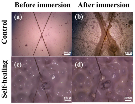 Optical microscope images of scratched control and self-healing coating samples before and after immersion for 48 h in a 25 wt % sodium chloride aqueous solution at −20 °C. (a) Control coating before immersion; (b) control coating after immersion; (c) self-healing coating before immersion; (d) self-healing coating after immersion.