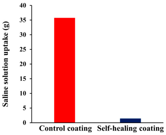 To evaluate the applicability of our STP/DD-based self-healing coating system to cementitious composite material at low temperature, a saline solution permeability test was conducted using mortars (Figure 8). Each specimen was prepared by applying the self-healing coating formulation to one rectangular side of a square column mortar (Figure S4). Control coatings and the self-healing coatings were stored, scratched, and then stored inside the low-temperature chamber at −20 °C. Optical microscopy showed that the scratch width was about 25 μm. The scratched surface of the self-healing and control coatings was immersed in a saline solution at −20 °C for 48 h. The uptake of saline solution in the scratched control specimen was 35.7 g. In contrast, when the self-healing coating was scratched, the saline solution uptake was 1.4 g. These results indicate that successful low-temperature self-healing of damage was accomplished in our self-healing coating system by preventing saline solution permeation.