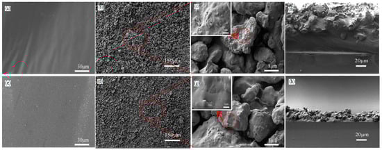 As shown in Figure 2a, the double-sided adhesive tape surface is smooth and cannot supply enough roughness. When the L-CNC particles are directly scattered onto the double-sided adhesive surface and rolled with the wooden bar, the L-CNC particles/double-sided tape coating (marked as D coating) is formed (as shown in Figure 2b). Under the action of the wooden bar, some of L-CNC particles are entirely buried inside the adhesive and thus lose the function to build surface roughness. Other L-CNC particles are only partially buried in the adhesive. The rest do not make contact with the adhesive. As can be seen from Figure 2c, the L-CNC particles are irregular and have a diameter of approximately 2–20 μm. The high-magnification image shows that the L-CNC particle surface has many nanoscale gaps and protuberances instead of being smooth. Therefore, the L-CNC particle itself is a micro-nano hierarchical structure, which is one of necessary conditions for a superhydrophobic coating. Similar to Figure 2a–c, Figure 2e–g show that the pure epoxy surface is also smooth, and the compounding pattern between the L-CNC particles and epoxy in the L-CNC/epoxy coating (marked as E coating) is the same as that of the D coating. Figure 2d,h show cross-sections of the D and E coatings; the different regions are able to be clearly distinguished between the glass slide, adhesives, and L-CNC particles. The thickness of the D and E coatings is estimated to be approximately 120 μm and 30 μm, respectively.