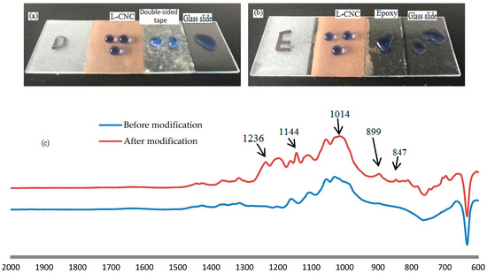Status of water droplets on (a) the untreated glass slide, the double-sided tape, and the glass slide treated with D coating, and (b) the untreated glass slide, the epoxy, and the glass slide treated with E coating; (c) FTIR spectra of the L-CNC particles before and after modification.