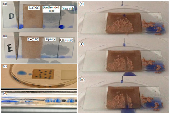 Figure 3a,b show that the untreated glass slide and the adhesive surfaces are hydrophilic and the water droplets (dyed blue with methylene) could spread out, resulting from a large amount of hydroxyl groups in the area. The water droplets on the glass slide treated with modified L-CNC particles could form spheres and rolled off easily with only slight shaking, and the static water contact angle (WCA) of the D coatings reach 163.5° and that of the E coating being 161.2°, while the slide angle (SA) of the D or E coating is less than 10°. This benefits from large amounts of F originating from 1H,1H,2H,2H-perfluorooctyltrichlorosilane (PFTS), which is currently known to have the lowest energy. As is known, it is difficult for liquid to infiltrate a material surface that has a lower surface free energy than the liquid. According to the Cassie wetting state, there is a thin layer of air in the interface between the water and the substrate. Compared with a smooth surface, the actual contact area between water droplets and the solid surface is smaller and there is less adhesion in a superhydrophobic surface, allowing the water droplets to roll off easily.