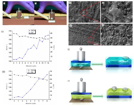 (a,b) Demonstration of one abrasion cycle; changes curves of WCA and SA of (c) the D coating and (d) the E coating during abrasion; surface status of (e,f) the D coating after 12 abrasion cycles and (g,h) the E coating after eight abrasion cycles; illustration of the L-CNC particles before and after abrasion in the (i) E coating and (j) the D coating.