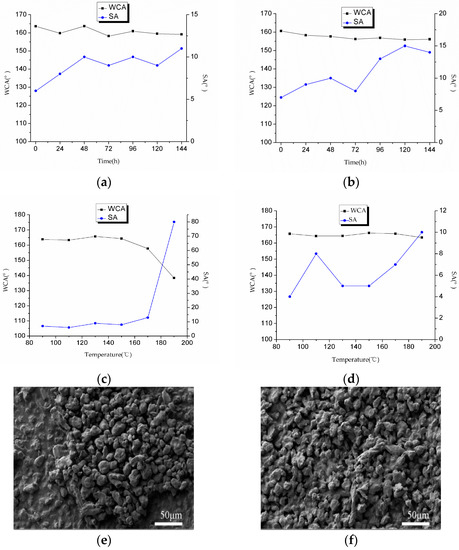 Heat resistance test: The coating was placed in an oven with 90 °C, 110 °C, 130 °C, 150 °C, 170 °C, and 190 °C for 2 h, and then the WCAs and SAs were measured, respectively.