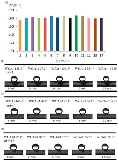 In the acid and alkali resistance tests, as shown in Figure 8a, the WCAs only showed a slight change, proving that the coatings could retain the surface structure and chemical components and that they had good resistance to acidic and alkali corrosion. To further test the coatings, water droplets with pH = 1, 7, and 14 were used to measure the WCA of the coatings; a measurement was taken every 3 min up to 12 min. The results are shown in Figure 8b,c; the WCA of the coatings decrease over time. At a water droplet with pH = 1, and the WCA shows only a reduction of 3.6° from 158.6° to 155.0° after 12 min. At a water droplet with pH = 14, it has only a reduction of 3.2° from 159.4° to 156.2° after 12 min. Lastly, at a water droplet with pH = 7, it also shows a similar reduction of 4.7° from 161.0° to 156.3° after 12 min. The reason for this small reduction of the WCAs is possibly that the gravity of the water droplets makes themselves sink after a long time, resulting in an increase of the contact area between the droplets and the coating surface. This demonstrates good acid and alkali resistance.