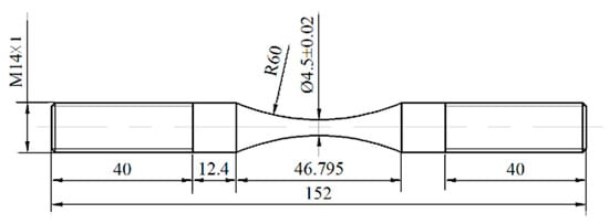 The material investigated in this study was a Cr-Ni steel for the driving shaft of automotives. Its chemical composition (mass percentage) is: 0.16 C, 0.37 Si, 0.60 Mn, 0.035 S, 0.035 P, 1.65 Cr, and 3.65 Ni. First, specimens were machined into the shape of an hourglass from the annealed steel bar with a diameter of 16 mm, and then the round-notch surfaces of specimens were polished by abrasive papers with grits from p600 to p2000 in the direction parallel to the specimen axis. The final shape and dimensions of the specimen are shown in Figure 1, where the diameter of the minimum-cross-section and the radius of round-notch are 4.5 mm and 60 mm, respectively. The estimated stress concentration factor of the specimen is about 1.02 according to the stress concentration handbook [].